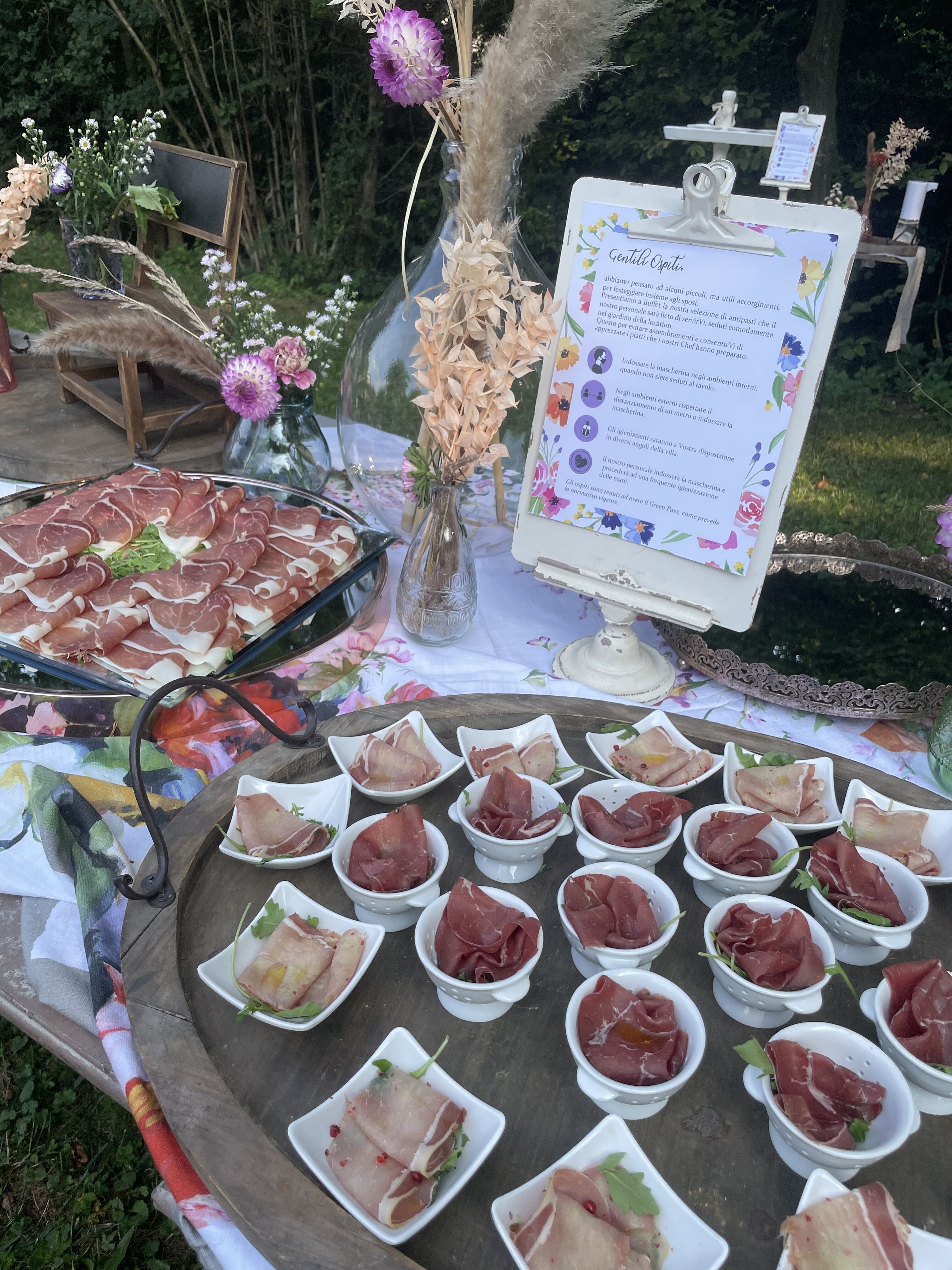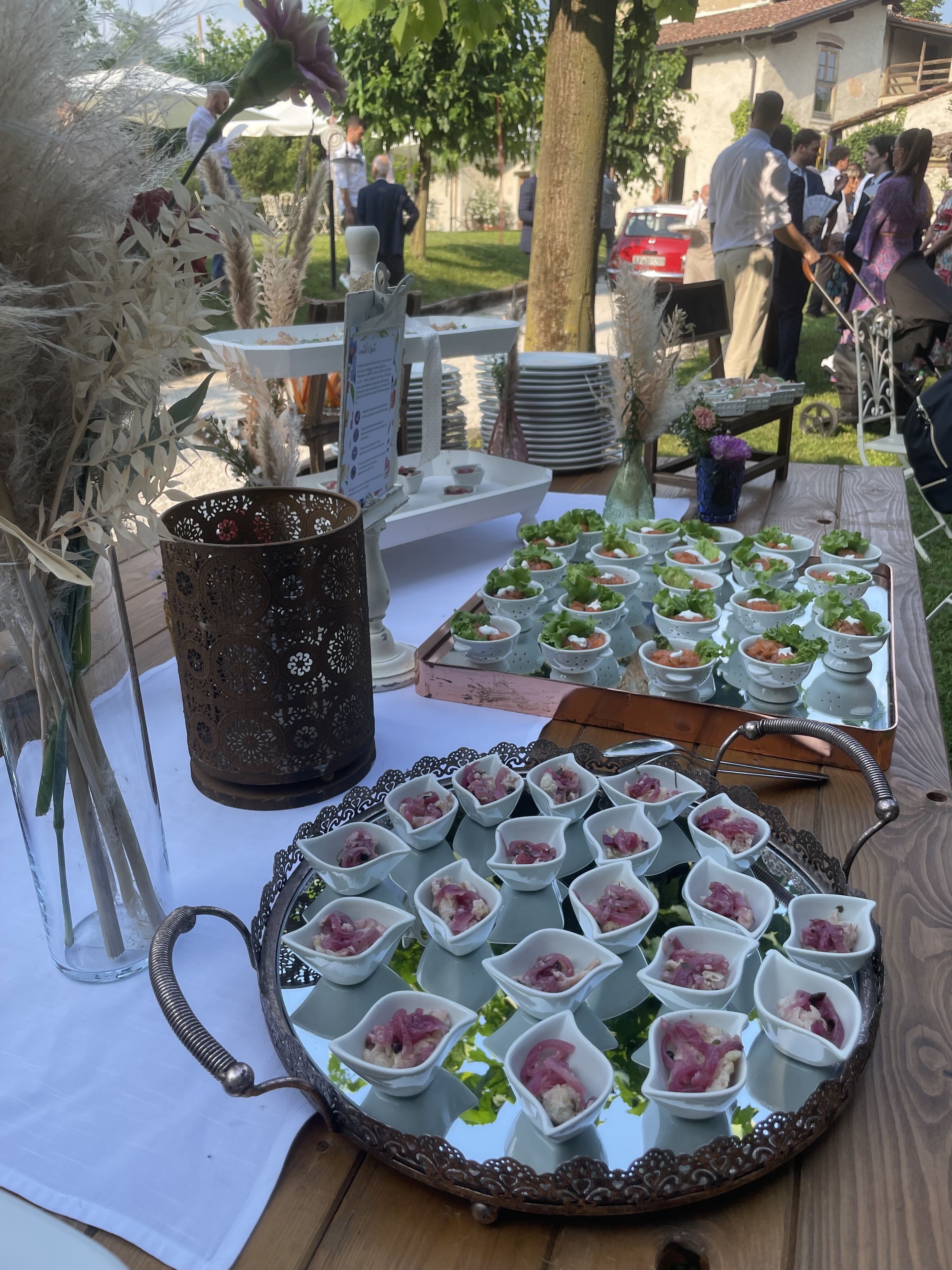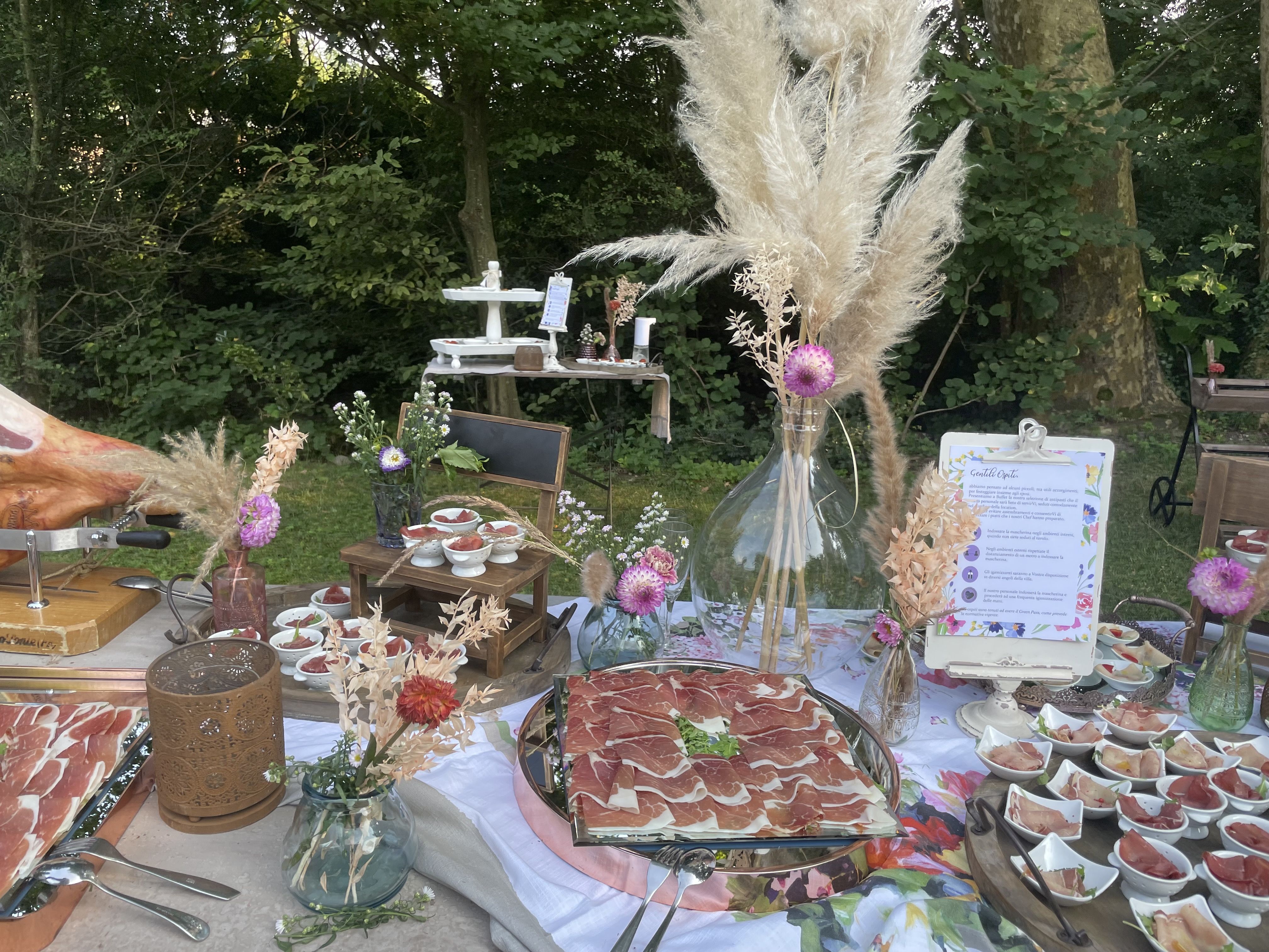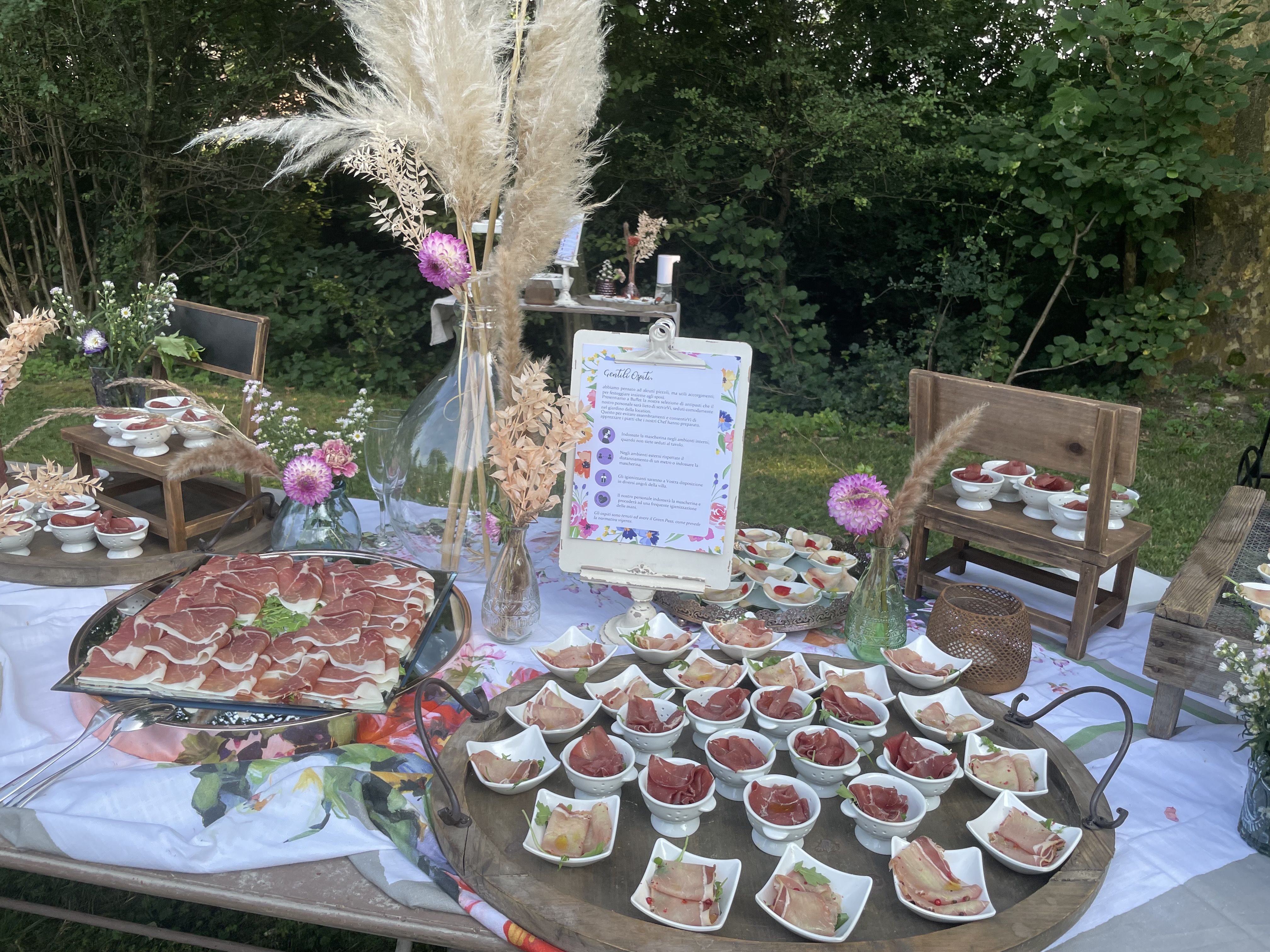 Per loro abbiamo studiato un menù con un aperitivo post cerimonia ricco, un entreè a tavola con burrata e gambero, un primo piatto ed il secondo. Il buffet di dolci e la torta sono stati serviti nella splendida corte della location. Tavoli antichi, credenze, lucine, candele, pampas e fiori colorati per incorniciare i nostri fingers.