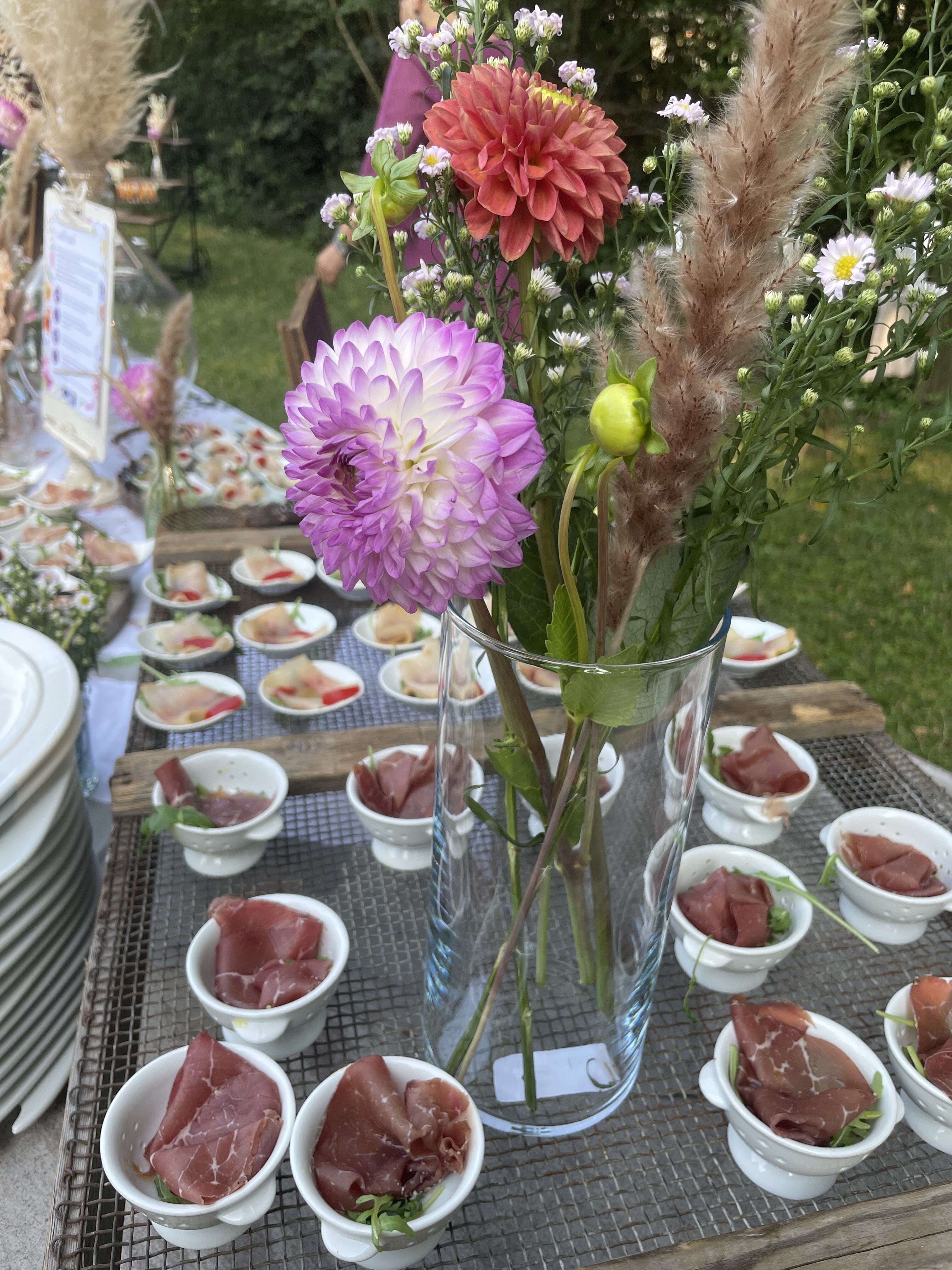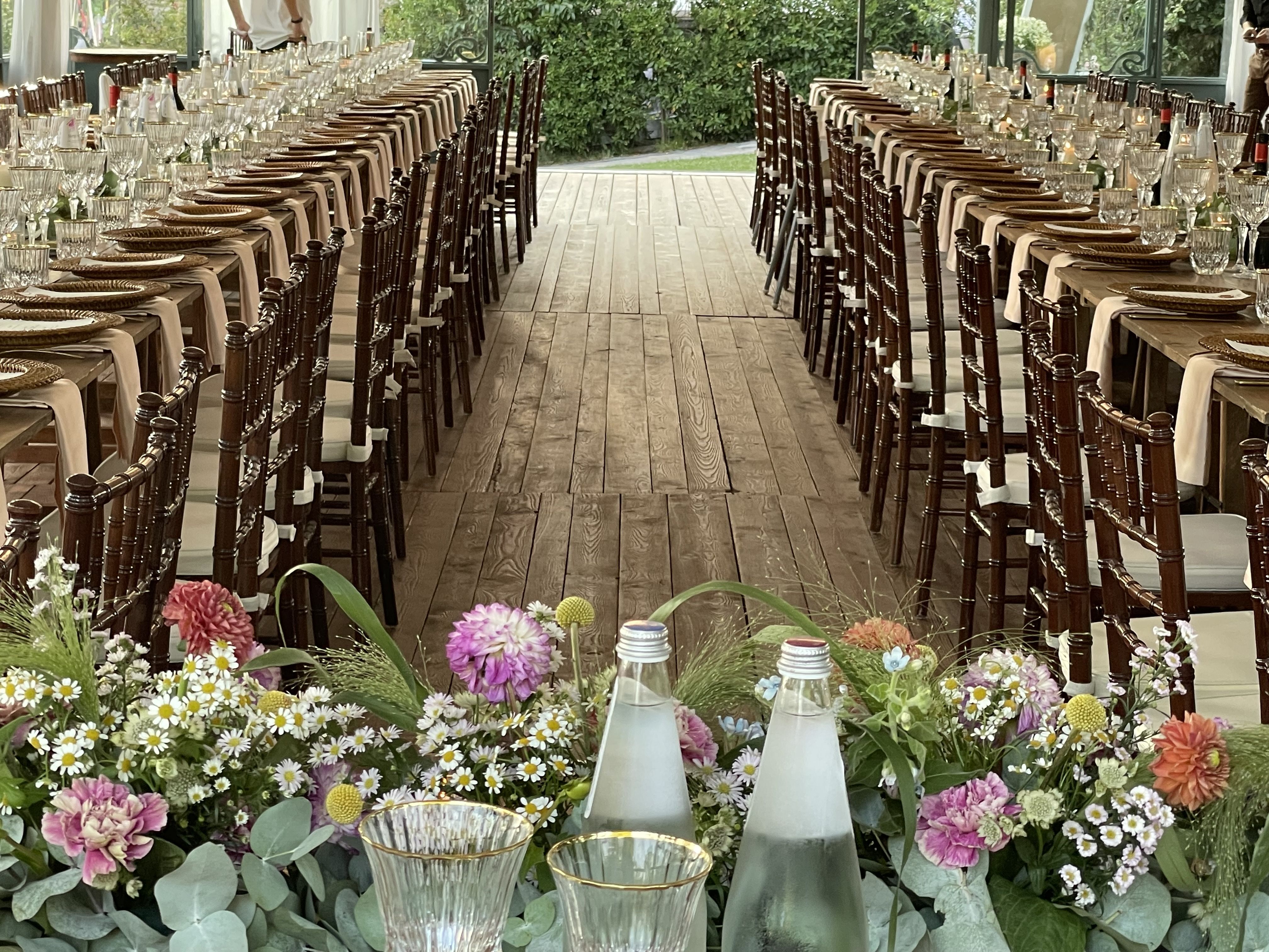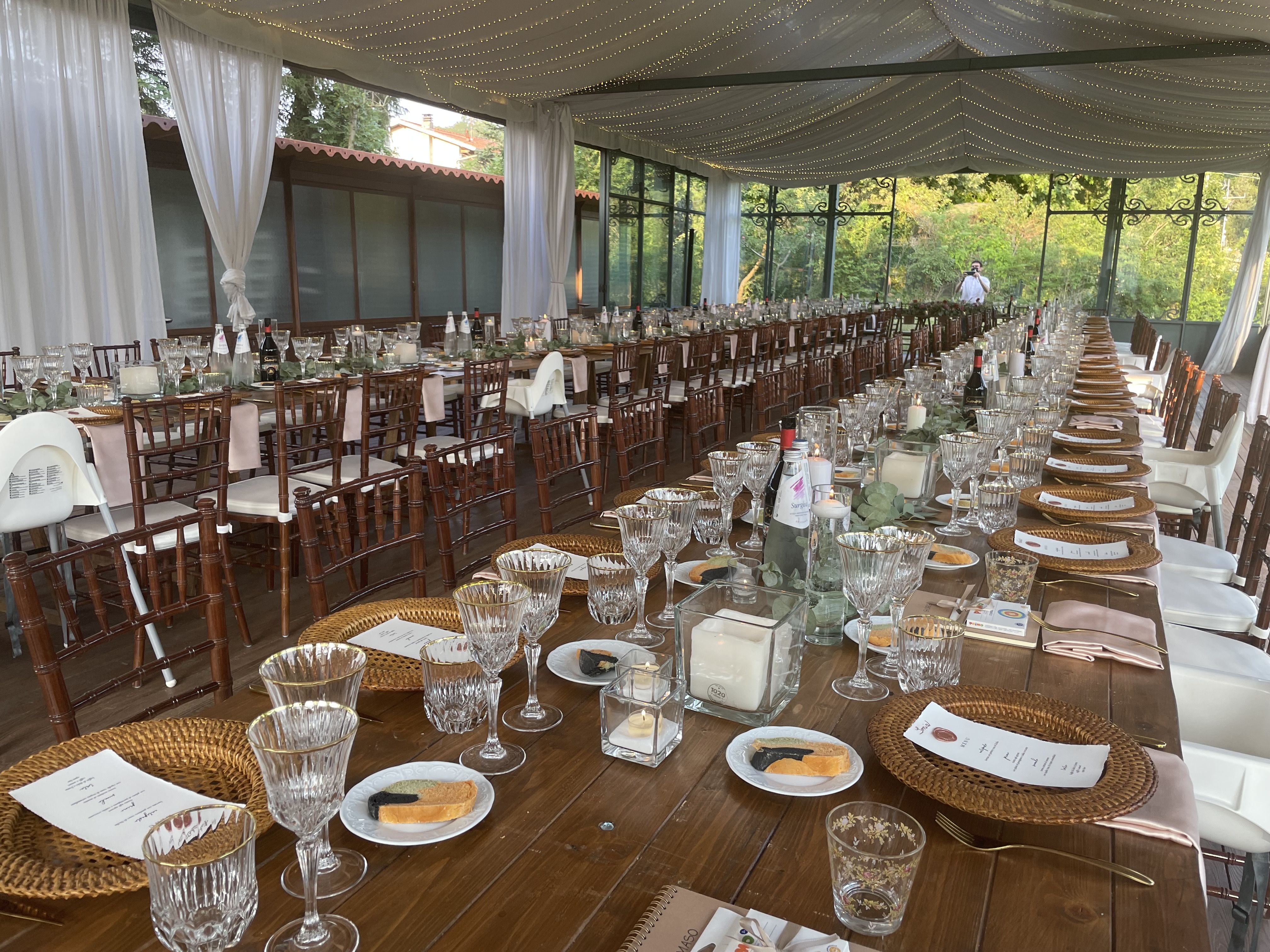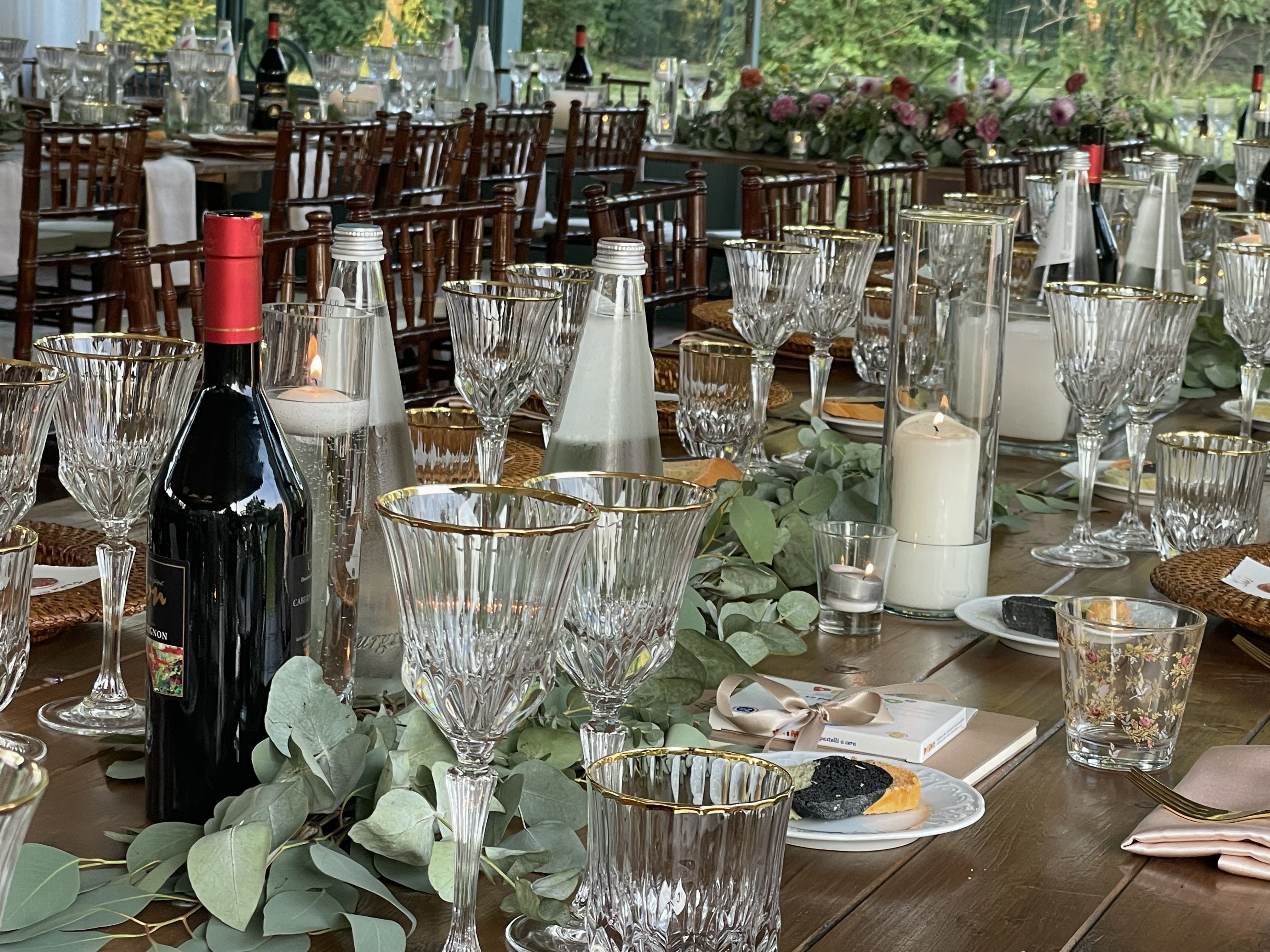 Per loro abbiamo studiato un menù con un aperitivo post cerimonia ricco, un entreè a tavola con burrata e gambero, un primo piatto ed il secondo. Il buffet di dolci e la torta sono stati serviti nella splendida corte della location. Tavoli antichi, credenze, lucine, candele, pampas e fiori colorati per incorniciare i nostri fingers.