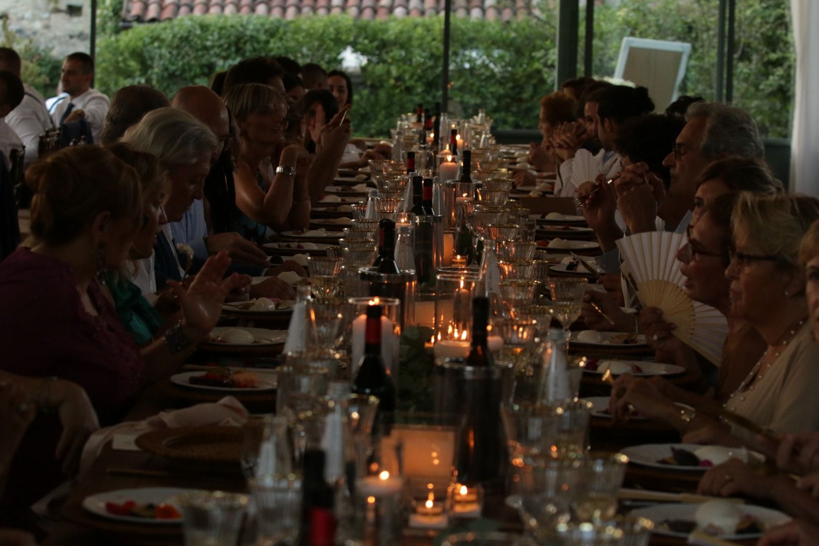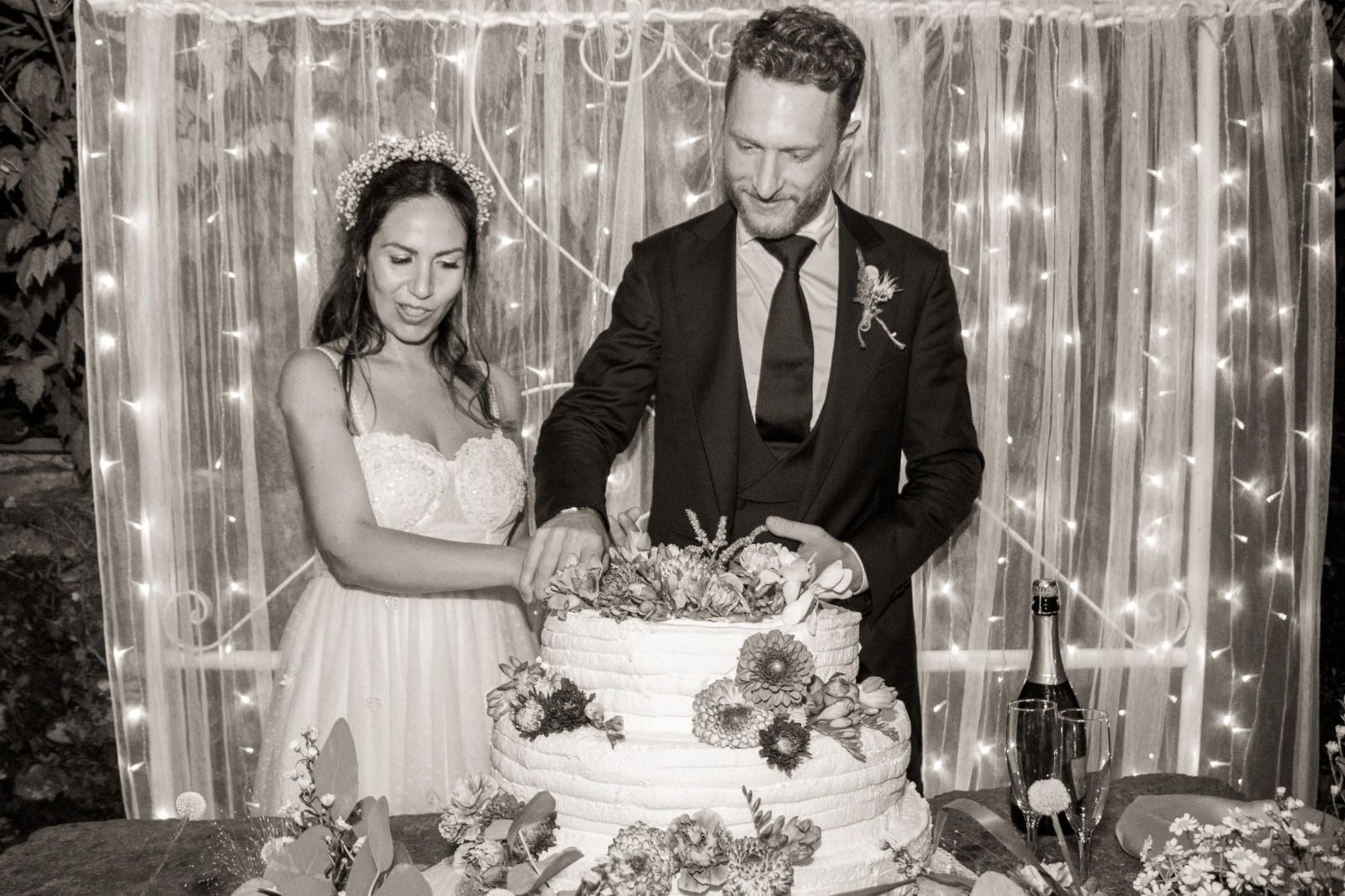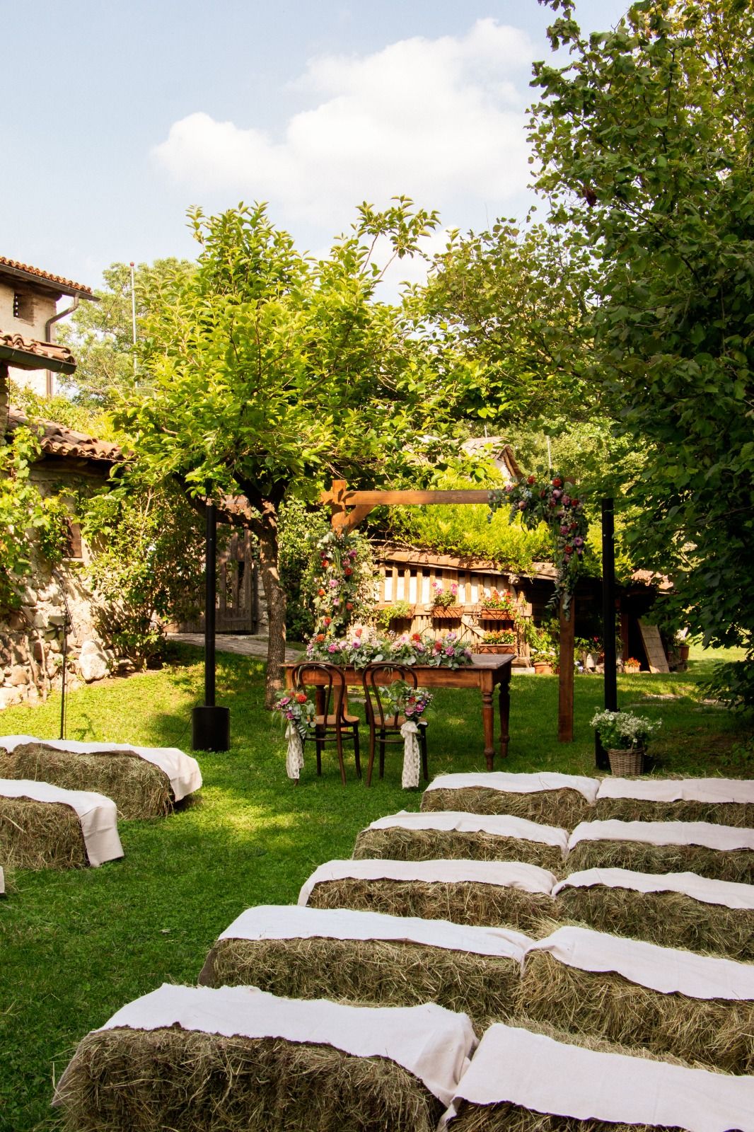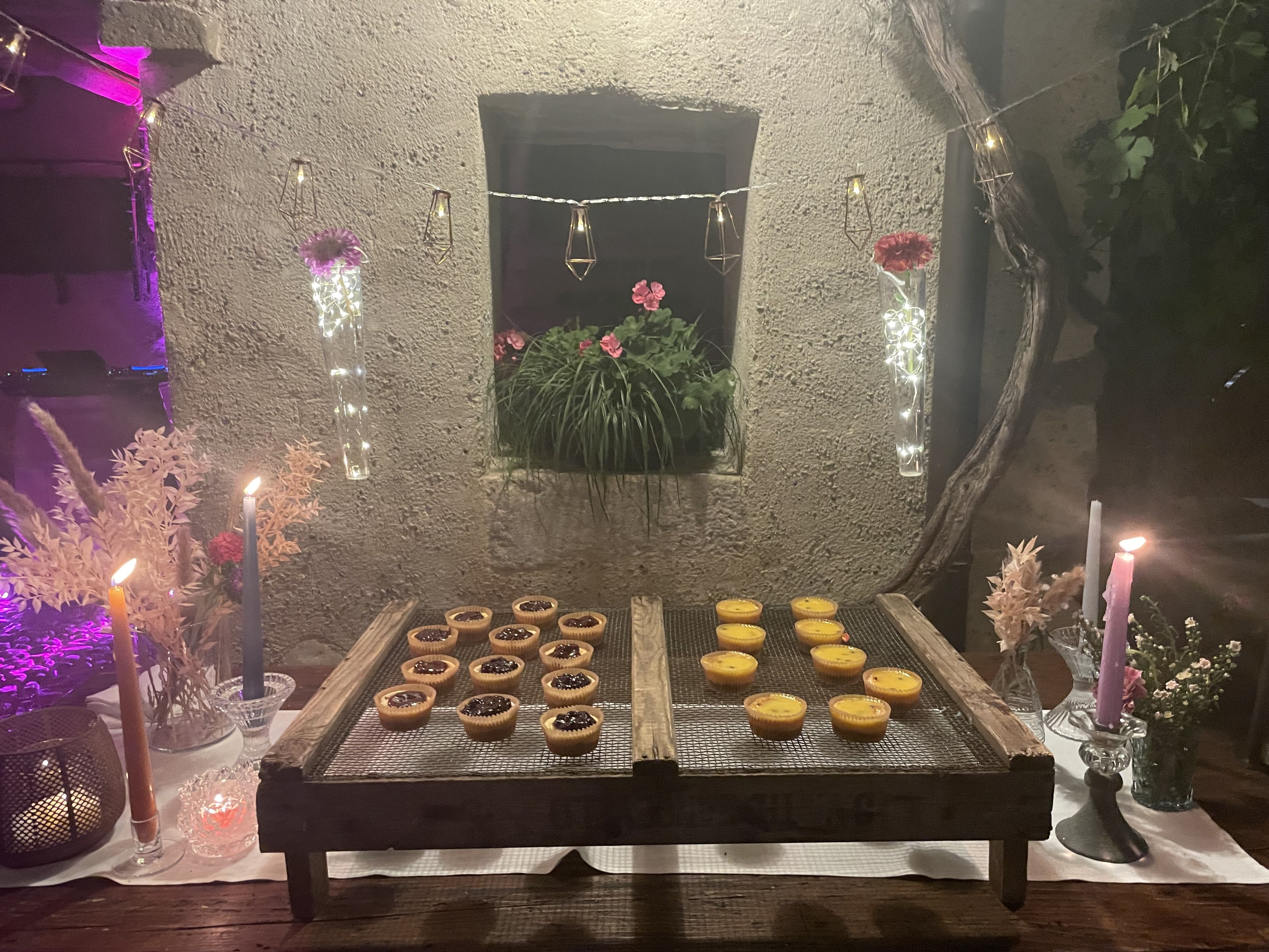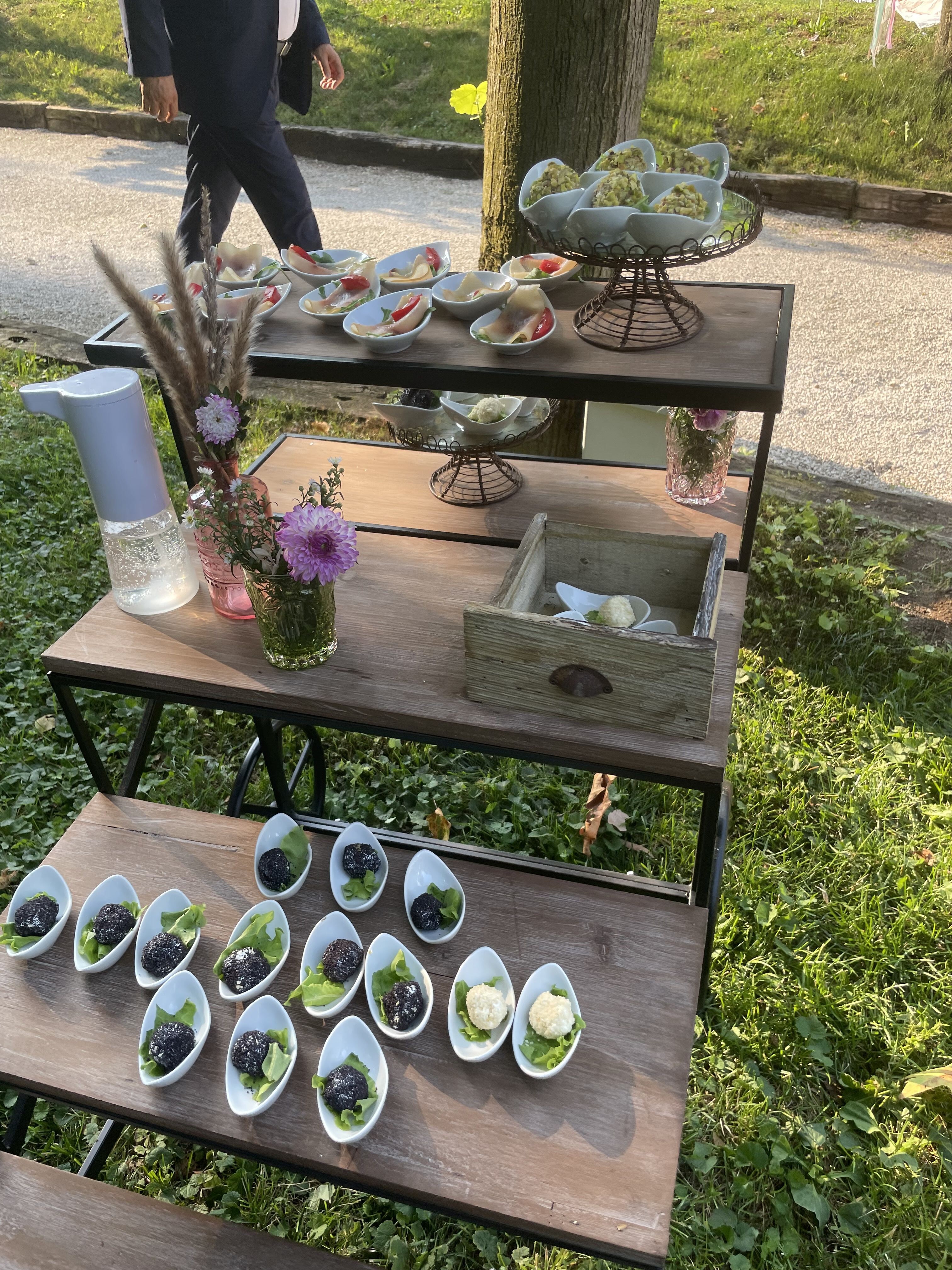 Per loro abbiamo studiato un menù con un aperitivo post cerimonia ricco, un entreè a tavola con burrata e gambero, un primo piatto ed il secondo. Il buffet di dolci e la torta sono stati serviti nella splendida corte della location. Tavoli antichi, credenze, lucine, candele, pampas e fiori colorati per incorniciare i nostri fingers.