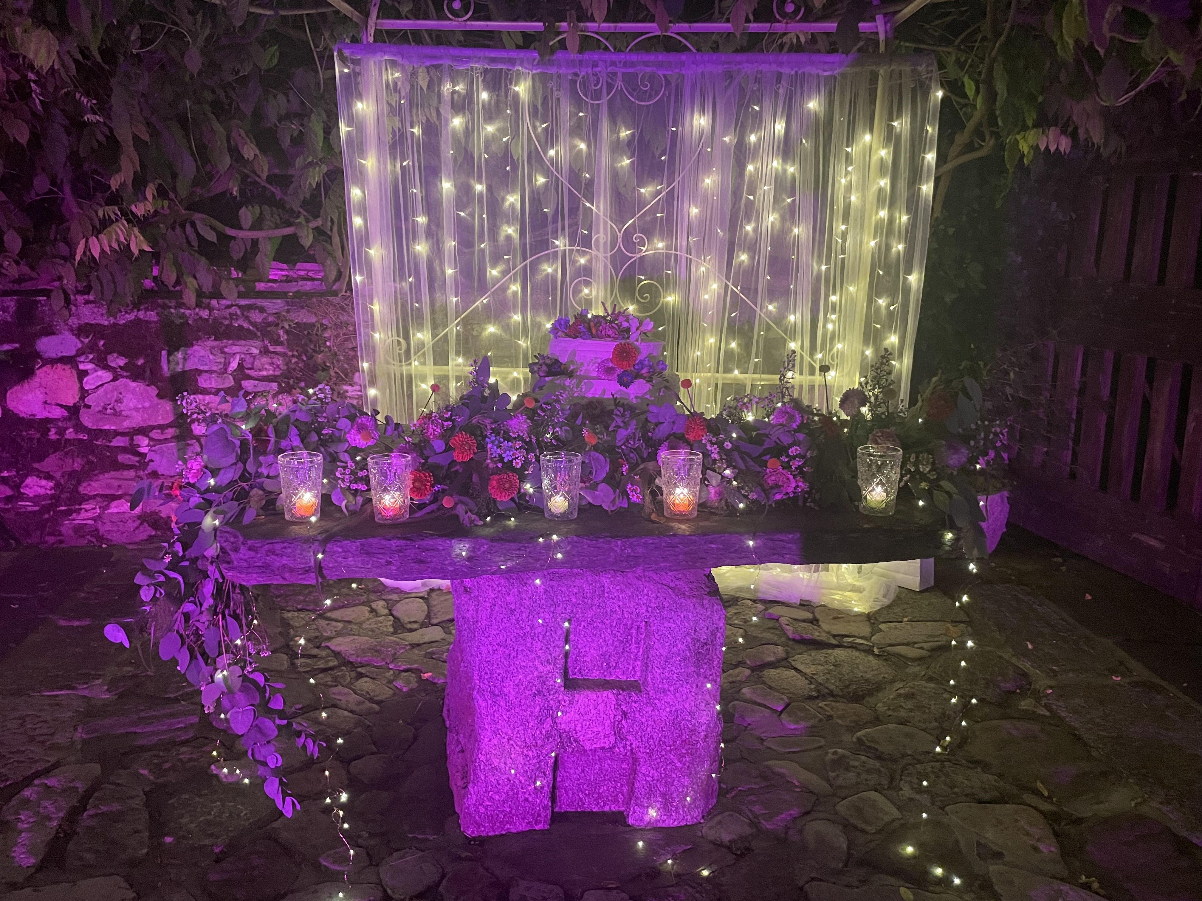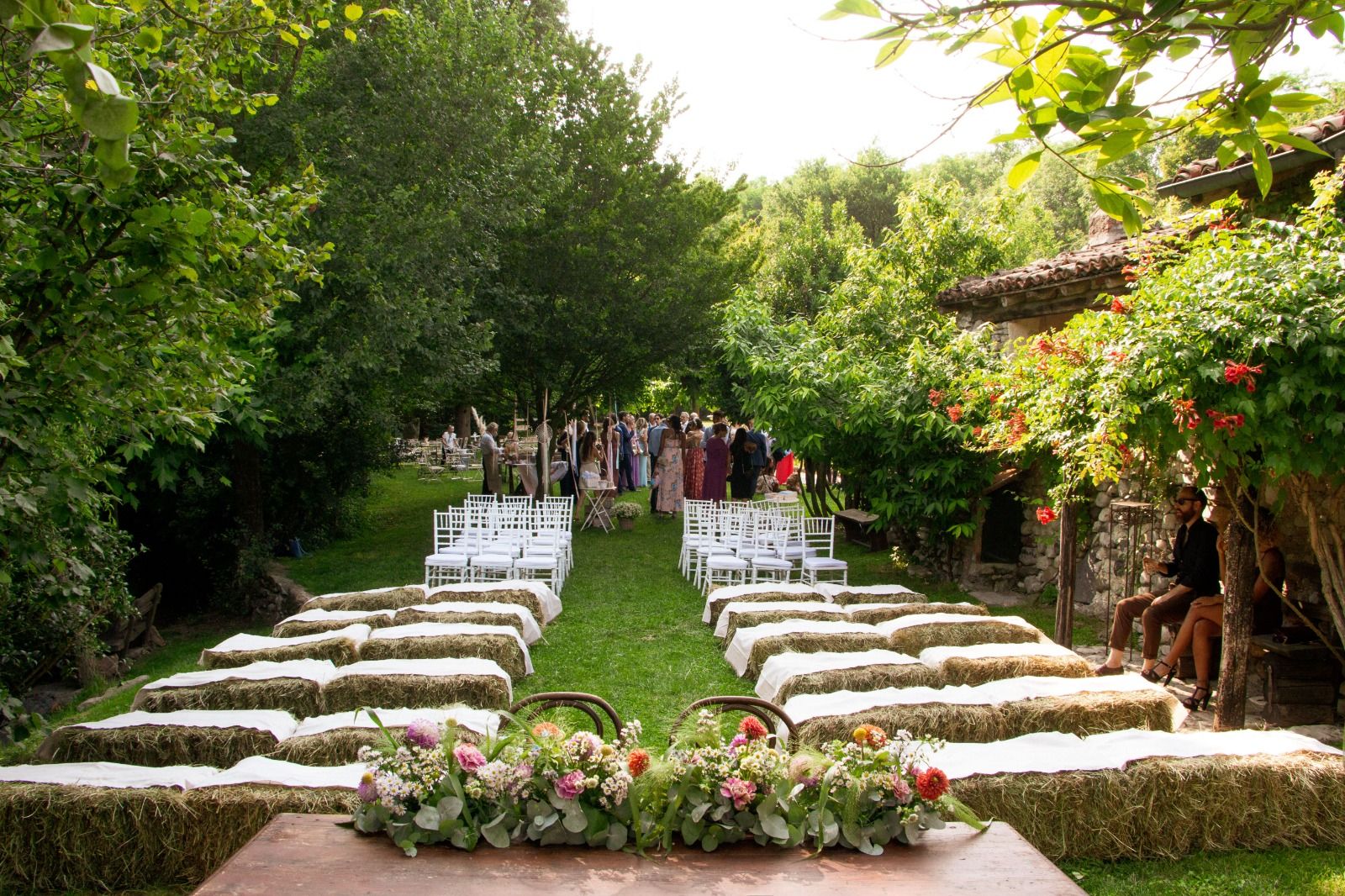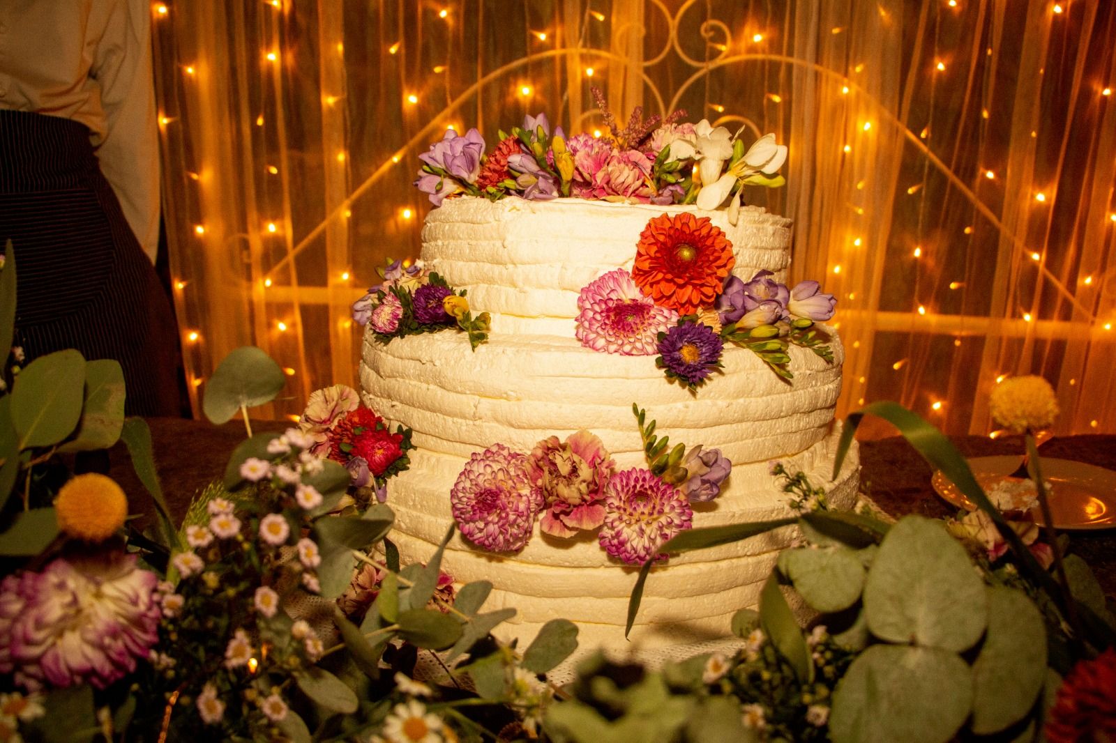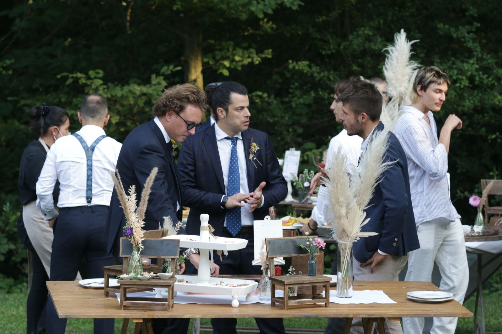 Per loro abbiamo studiato un menù con un aperitivo post cerimonia ricco, un entreè a tavola con burrata e gambero, un primo piatto ed il secondo. Il buffet di dolci e la torta sono stati serviti nella splendida corte della location. Tavoli antichi, credenze, lucine, candele, pampas e fiori colorati per incorniciare i nostri fingers.