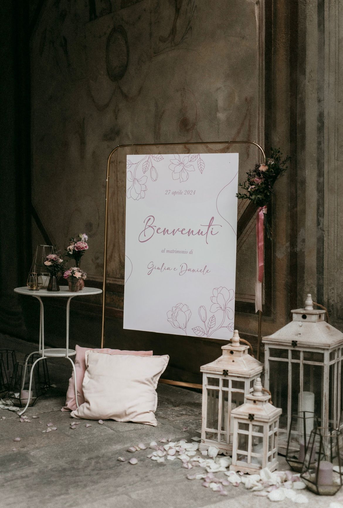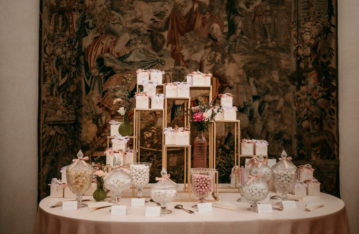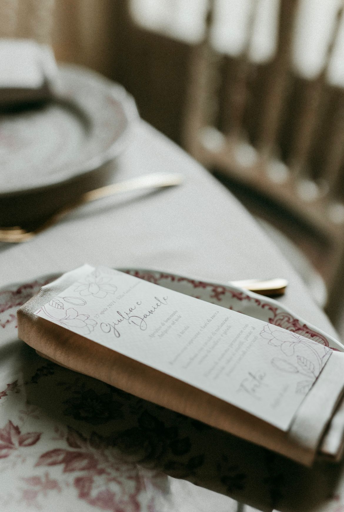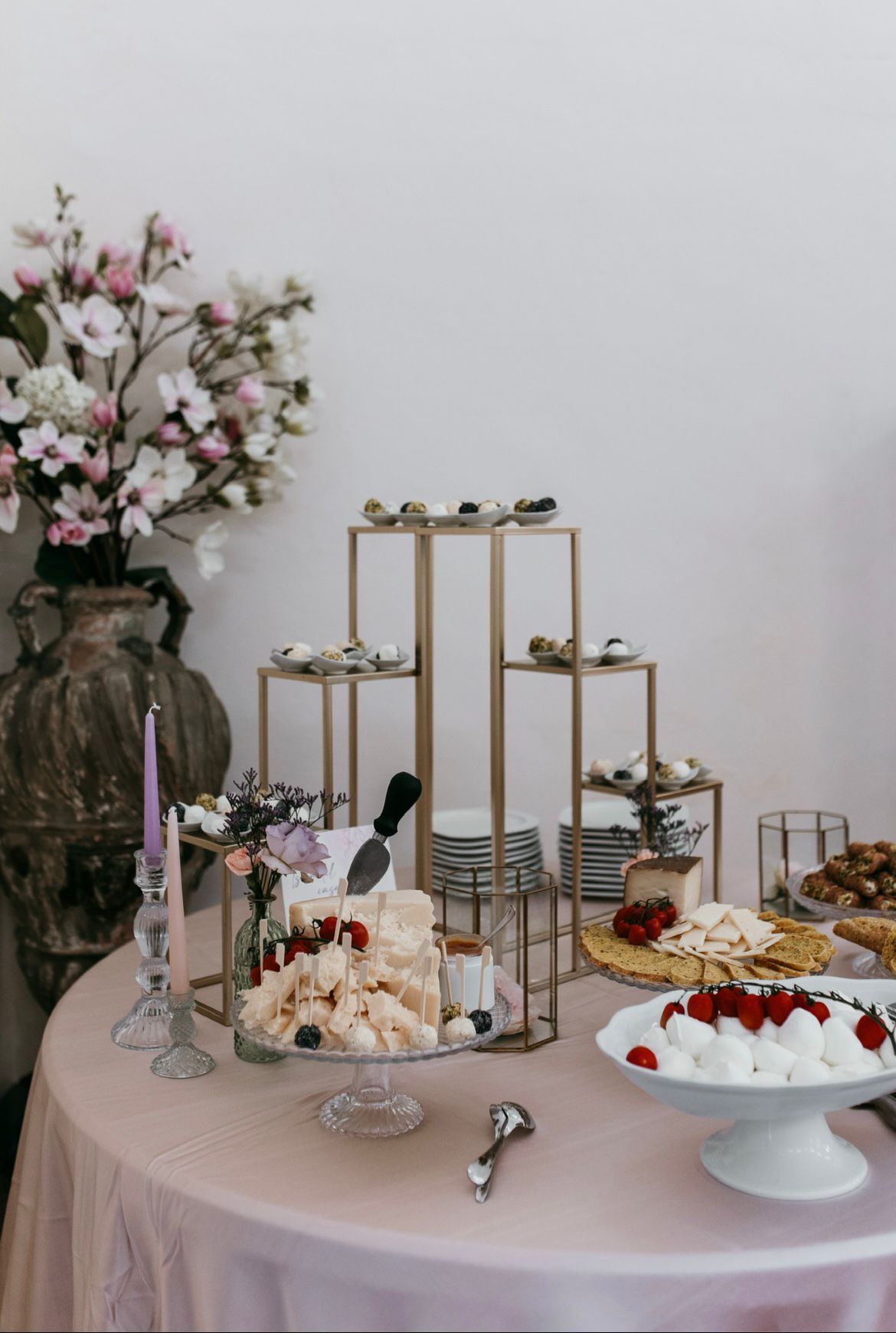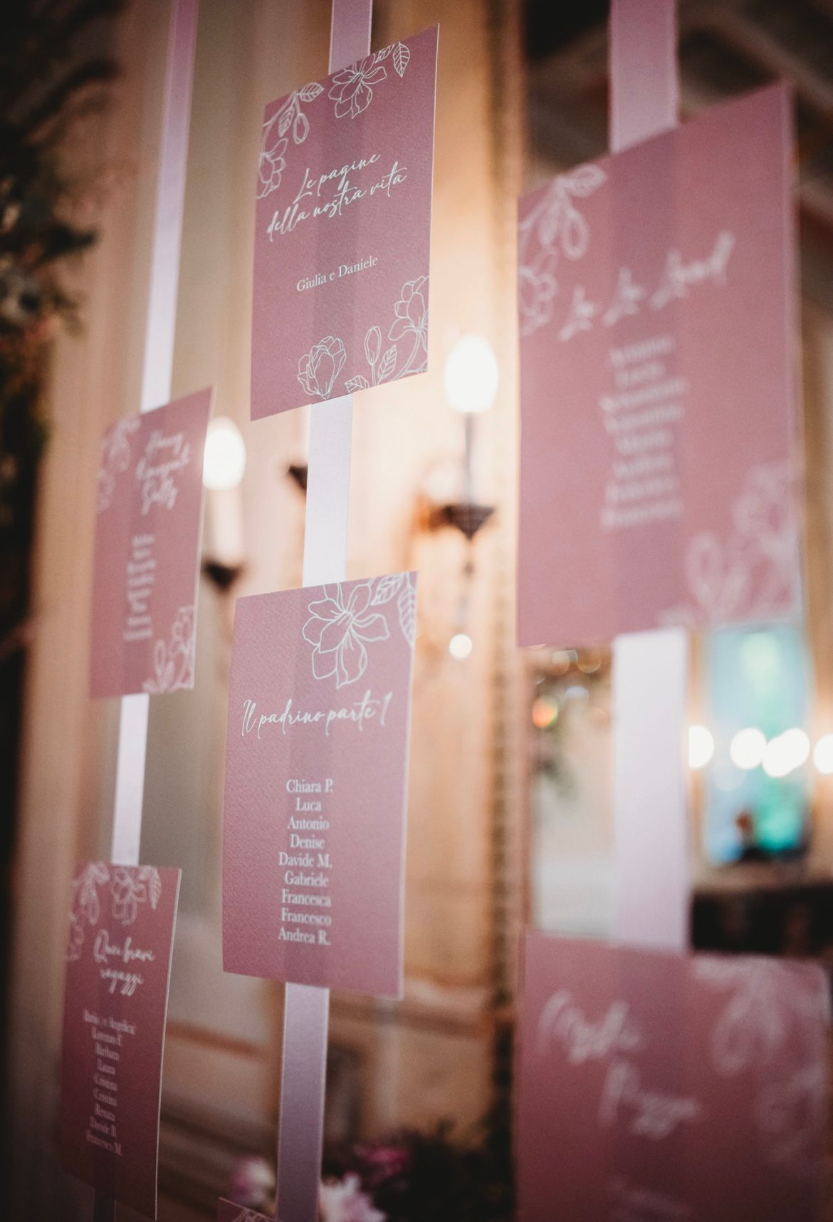 Il colori cipria e burgundy scelti dalla sposa sono stati utilizzati per gli allestimenti del buffet, stesso richiamo per la mise en place che richiamava le tinte e manteneva lo stile della location.